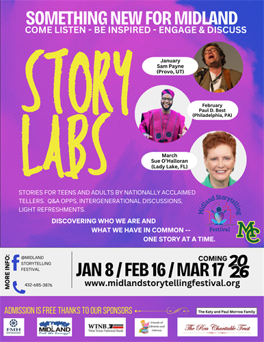 Story Labs is a collaboration between Midland Storytelling Festival and Midland College to present an evening of storytelling and intergenerational discussion. This month's Lab takes place on St. Patrick's Day and in true storytelling fashion it will feature master storyteller Sue O'Halloran. Food is provided for this family friendly interaction that discovers what people (target ages teens - adults) have in common. The shared impact of the stories presented is insightful, interesting and FUN! Admission is free.